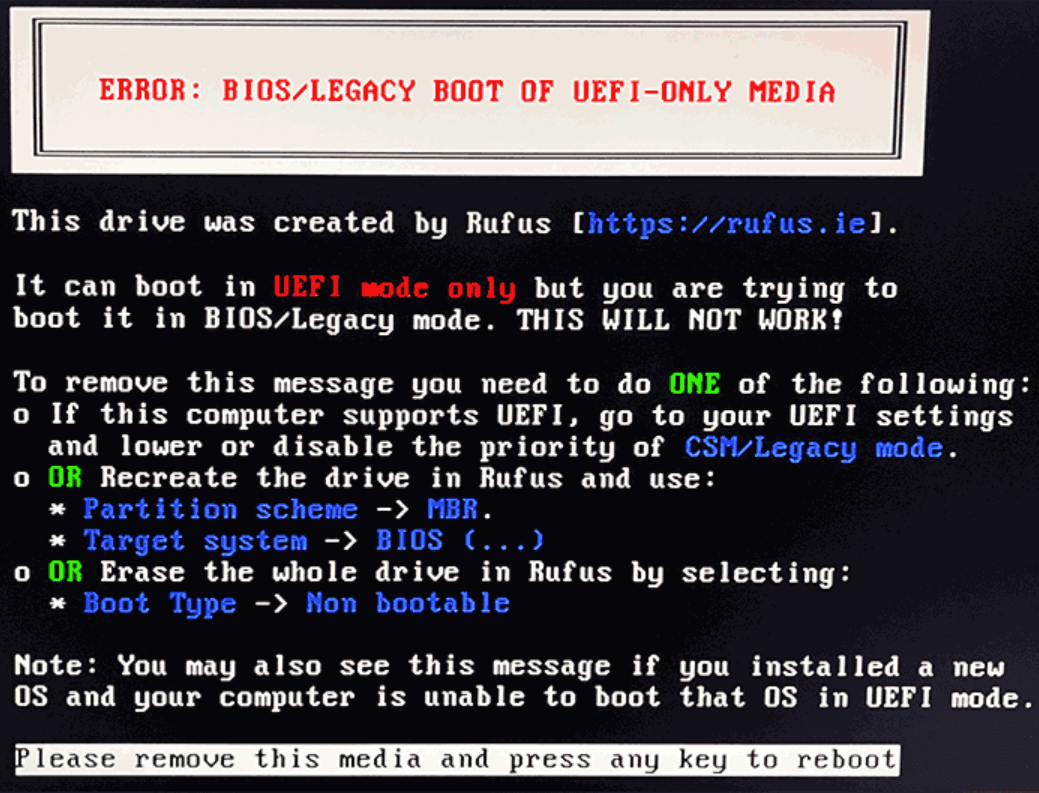 Lo que básicamente te obligará a reiniciar la PC y recrear nuevamente la USB, usando el esquema correcto.